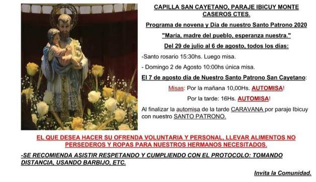 El viernes 7, día en que se celebra la Fiesta Patronal, en la capilla de San Cayetano, ubicada en Paraje Ibicuy, situada a 16 kilómetros de Monte Caseros, la cual recibe anualmente a centenares de devotos quienes concurren a la tradicional celebración para pedir y agradecer el pan y el trabajo, será epicentro de las actividades centrales, pero bajo un estricto protocolo.