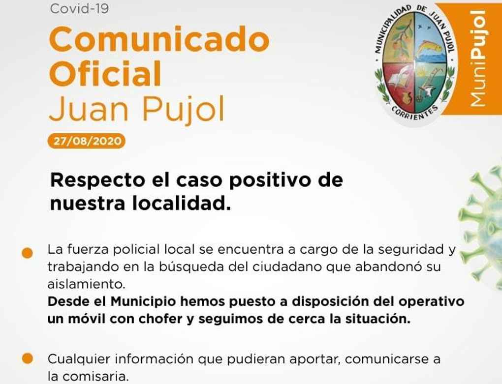 Desde la Municipalidad de Juan Pujol por medio de un comunicado indican que “la fuerza policial local se encuentra a cargo de la seguridad y trabajando en la búsqueda del ciudadano que abandonó su aislamiento. Desde el Municipio hemos puesto a disposición del operativo un móvil con chofer y seguimos de cerca la situación”.