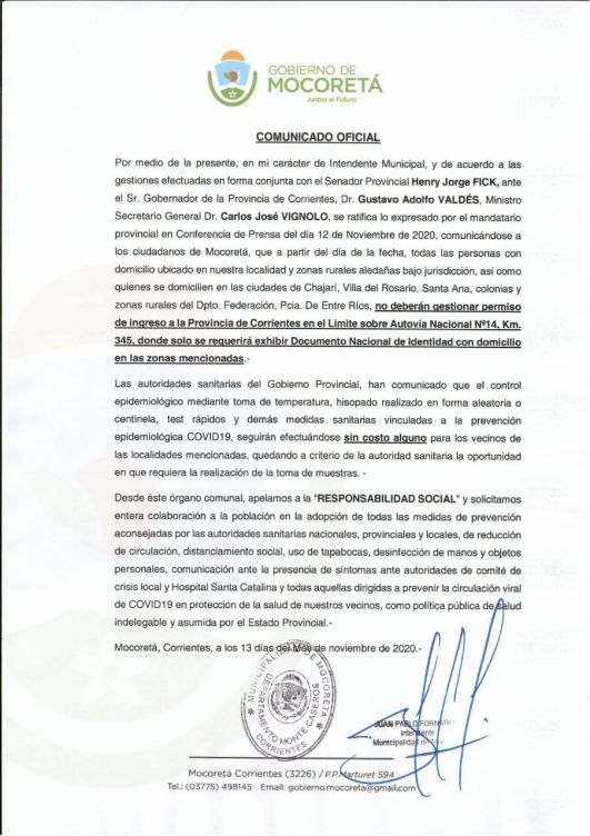 El Intendente de Mocoretá Juan Pablo Fornaroli emitió un comunicado oficial, en el que se refiere a las ultimas medidas tomadas por el Gobierno Provincial, en relación a a los premisos para el ingreso a la provincia por la Autovía Nacional 14 en el km 345.
