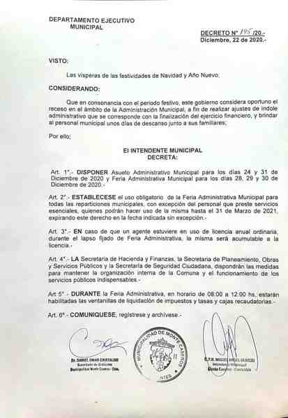 La Feria Administrativa Municipal se extenderá desde el 28 al 30 de diciembre. Los días 24 y 31 habrá asueto administrativo. Las actividades se retomarán el 4 de enero de 2021, A través del decreto 145/20.