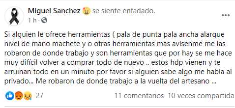"Si alguien le ofrece herramientas (pala de punta, pala ancha, alargue nivel de mano, machete y otras herramientas más avísenme me las robaron de donde trabajo y son herramientas que se me hace muy difícil volver a comprar todo de nuevo .. estos h... vienen y te arruinan todo en un minuto por favor si alguien sabe algo me habla al privado... Me robaron de donde trabajo a la vuelta del artesano".