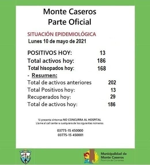Por medio del parte oficial emitido diariamente por la Municipalidad de Monte Caseros, el Comité de Crisis informó que este lunes 10 de mayo se han realizado 168 (ciento sesenta y ocho) Test Rápidos Antígenos, de los cuales 13 (trece) arrojaron resultado POSITIVO. Se han reportado 29 pacientes recuperados. El total de casos activos es de 186.