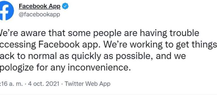 “Somos conscientes que algunas personas tienen problemas para acceder a la aplicación de Facebook. Estamos trabajando para que todo vuelva a la normalidad lo antes posible y pedimos disculpas por cualquier inconveniente”, indicó Facebook en su cuenta de Twitter.