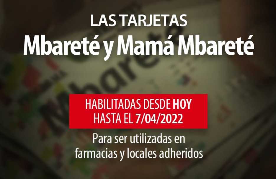 El Gobierno provincial, a través del Ministerio de Salud Pública comunica que las tarjetas Mbareté y Mamá Mbareté se encuentran habilitadas desde el día de la fecha 18 de marzo del 2022) hasta el 7 de abril inclusive, para ser utilizadas por los beneficiarios de las mismas.