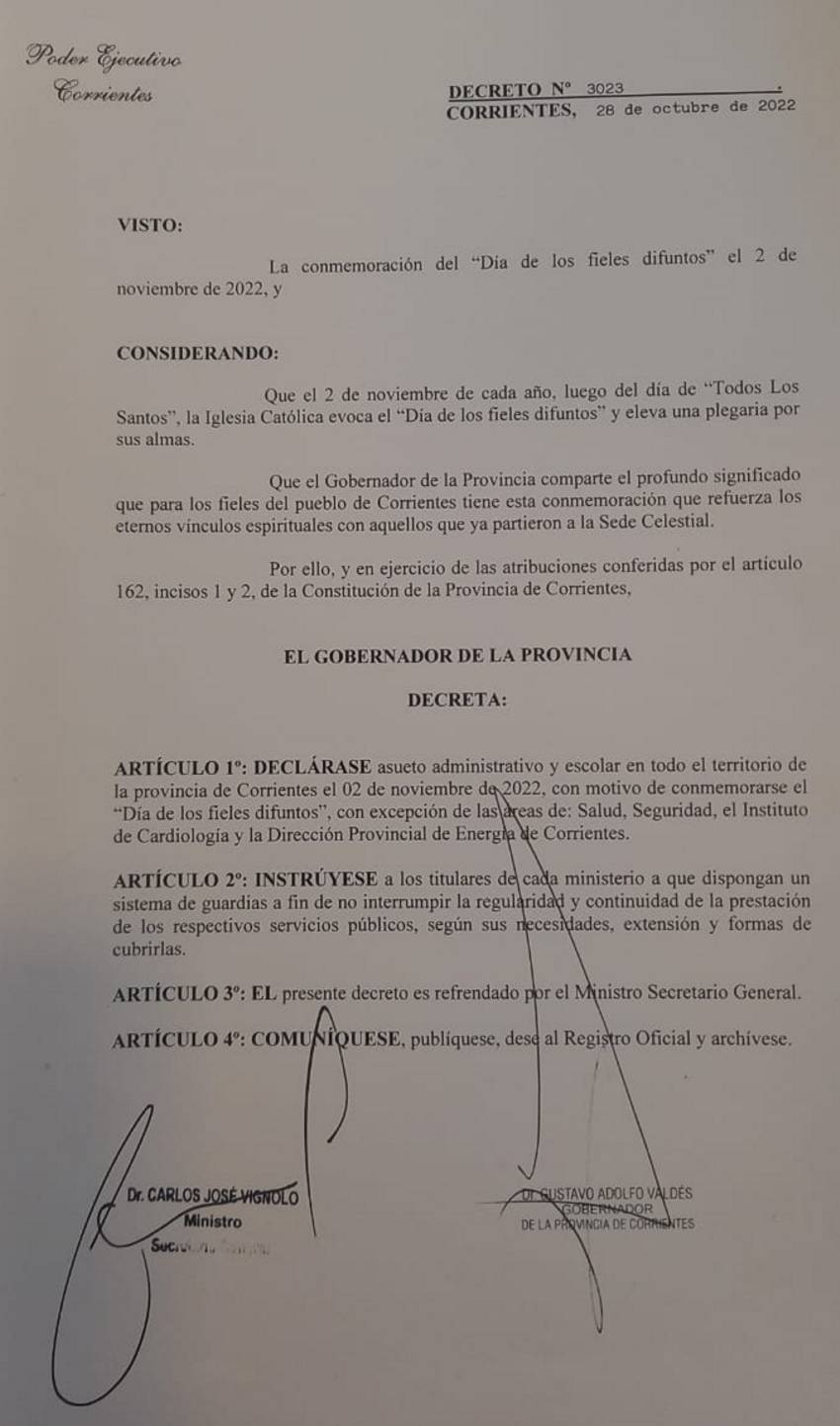 Mediante el decreto N°3023, el gobernador Gustavo Valdés declaró para el próximo miércoles 2 de noviembre, el asueto administrativo y escolar en todo el territorio de la provincia de Corrientes al conmemorarse el “Día de los Fieles Difuntos”.