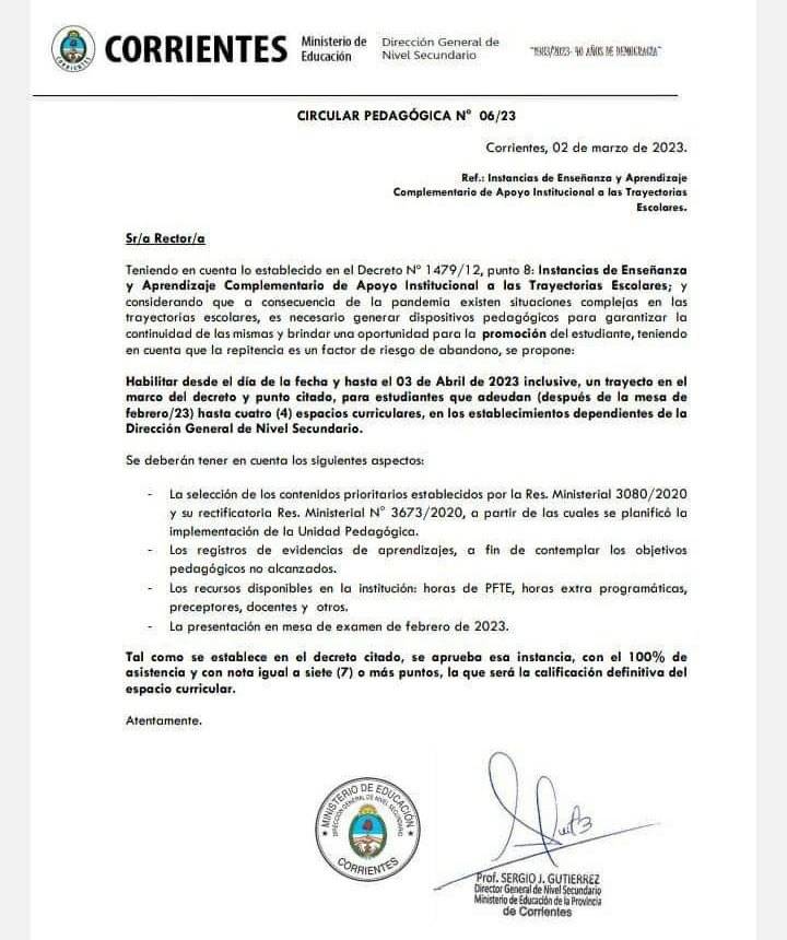 El ministerio de Educación de la provincia emitió la circular pedagógica n°6/23 en el que se recuerda que el punto ocho del decreto provincial número 1479 del año 2012, se mantiene vigente y habilita la posibilidad de "instancias de enseñanza y aprendizaje complementario de apoyo institucional a los trayectos escolares". Por eso hasta el 3 de abril cada escuela deberá habilitar el espacio curricular necesario para que los estudiantes que adeuden hasta cuatro materias, puedan realizar el proceso de aprendizaje y que, cumplido el plazo, el docente pueda determinar si el alumno alcanzó la calificación definitiva de 7. La asistencia del 100 por ciento a las clases es una de las condiciones excluyentes.