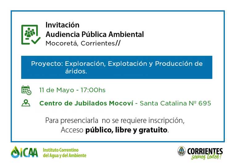 Este jueves 11 de mayo a las 17 será la Audiencia Pública Ambiental en la localidad de Mocoretá, convocada por el Instituto Correntino del Agua y del Ambiente (ICAA), para el proyecto de renovación de viabilidad ambiental de Exploración, Explotación y Producción de Áridos de Empresa Olindo en Colonia San Gregorio, Cuarta Sección Rural de la ciudad de Mocoretá, Departamento Monte Caseros.