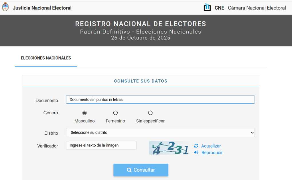 Los correntinos pueden verificar su lugar de votación ingresando al sitio oficial de la Cámara Nacional Electoral, en www.padron.gob.ar