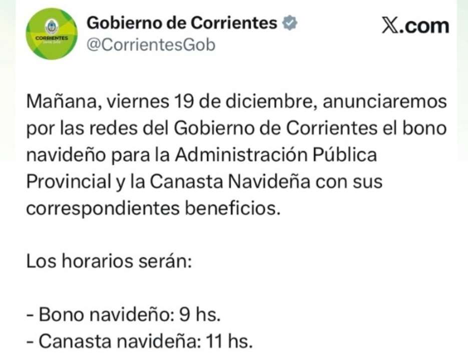 Según se comunicó a través de las redes sociales oficiales del Gobierno de Corrientes, a las 9 horas se dará a conocer el bono navideño destinado a los trabajadores provinciales. Posteriormente, a las 11 horas, se anunciarán los detalles de la Canasta Navideña, junto con los beneficios correspondientes.