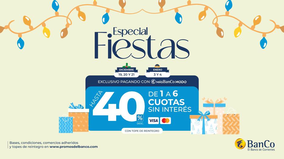 Con tarjeta de crédito, débito y modo El Banco de Corrientes lanza sus promociones de fin de año con descuentos de hasta el 40% y cuotas sin interés  El Banco de Corrientes vuelve a acompañar a las familias correntinas en estas fiestas con beneficios exclusivos que impulsan el consumo y fortalecen el comercio local. Durante diciembre y los primeros días de enero, los clientes podrán acceder a importantes descuentos en una amplia variedad de rubros, pagando con tarjetas del BanCo y la billetera MÁS Banco MODO.