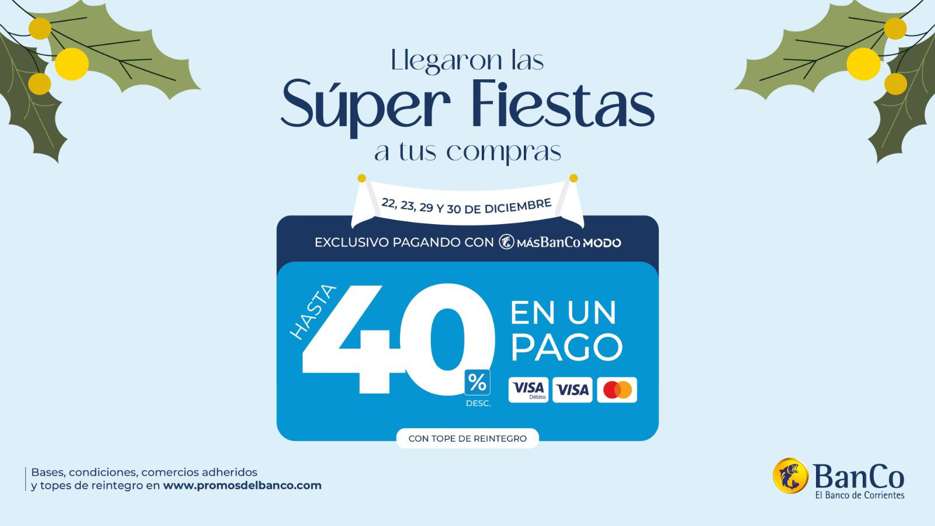 Promociones de fin de año Comenzó “Súper Fiestas”, la promoción del Banco de Corrientes para las compras navideñas  Este lunes 22 de diciembre fue el primer día de vigencia de “Súper Fiestas”, la propuesta del Banco de Corrientes que ofrece hasta 40% de reintegro en supermercados y comercios adheridos de toda la provincia.
