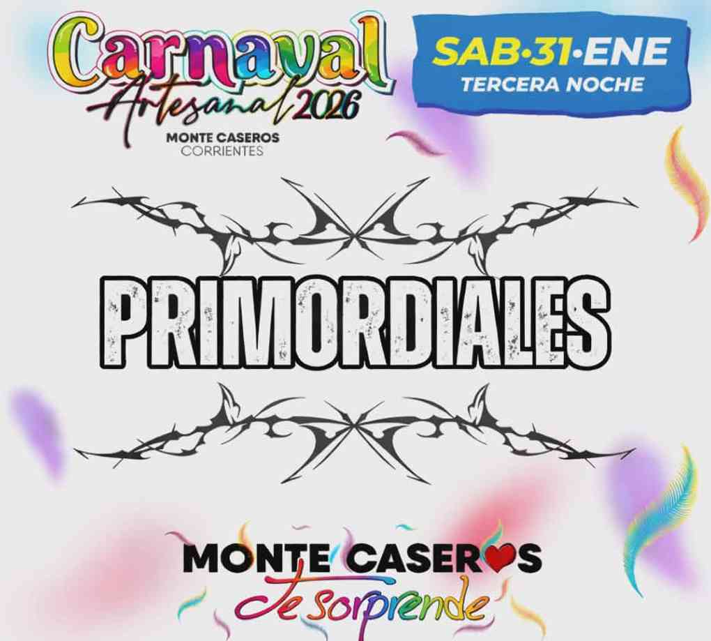 En la tercera llega "Los Primordiales" Monte Caseros late al ritmo del Carnaval y se prepara para más noches de fiesta en el Paso de los Higos  Monte Caseros vive a pleno su máxima celebración popular. Tras dos noches oficiales cargadas de brillo, música y tradición, el Carnaval Artesanal del País continúa desplegando toda su magia en el Corsódromo “Paso de los Higos”, donde aún restan cuatro noches para seguir disfrutando de uno de los eventos más esperados del verano.