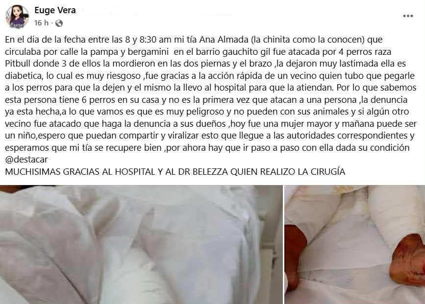Según relató en redes sociales la vecina Eugenia Vera, su tía, Ana Almada —conocida como “La Chinita”— fue atacada por cuatro perros de raza pitbull, de los cuales tres la mordieron en ambas piernas y en uno de sus brazos, provocándole heridas de consideración.