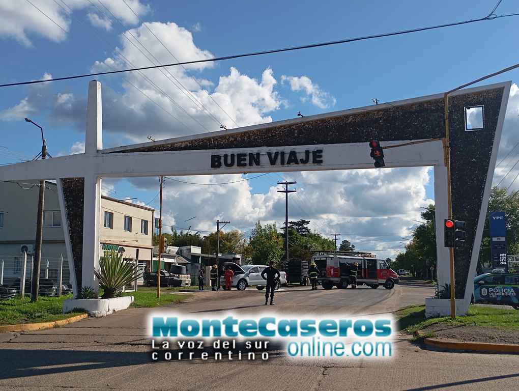 El accidente ocurrió en la intersección de Juan Pujol y Bergamini. Personal policial y una ambulancia trabajaron en el lugar asistiendo a los involucrados.