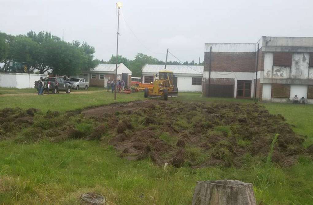 Personal dependiente de la Secretaria de Planeamiento, Obras y Servicios Públicos de la Municipalidad, lleva adelante tareas de construcción de un predio deportivo en la Escuela Agrotécnica “República de Venezuela”.