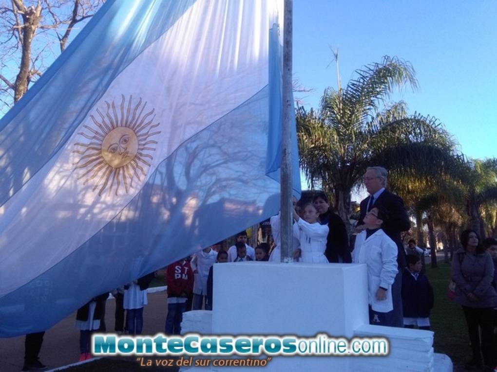 Siendo las 08:00 horas con la presencia del Intendente Miguel Olivieri, la Directora Araceli Martín de la Escuela Nº 646 “Pedro Rómulo Tuoti” establecimiento custodio del Monumento a San Martín emplazado en la esquina de Juan Pujol y Av. El Libertador, docentes y alumnos desplegaron con orgullo la celeste y blanca, desde el edificio escolar hasta el mástil.
