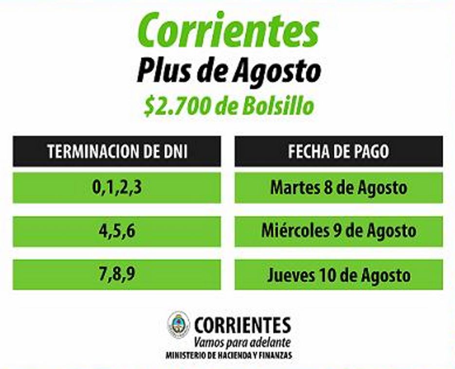 El jefe de la cartera económica correntina, Enrique Vaz Torres, acompañado por su equipo económico, informó los días de pagos. “Entre este martes 8 y el jueves 10, la Provincia pagará el adicional mensual de $2.700; y entre el 28 y 30 próximo, abonará los sueldos correspondientes a agosto, con aumentos para los sectores Administración Central incluyendo Salud, y Seguridad”