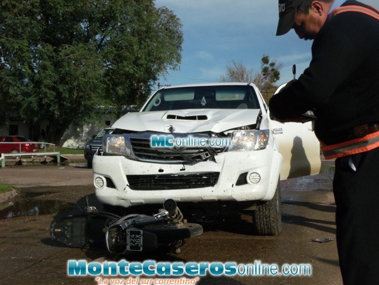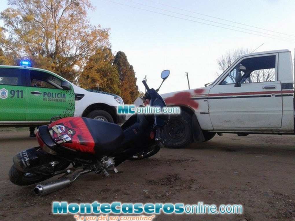 Una camioneta Pick Up Toyota dominio TXK 551 conducida por Miguel Del Orto de 42 años de edad y una motocicleta Ghiggeri 110 CC guiada por Ricardo Elvio Giménez de 32 años protagonizaron un accidente de tránsito, el hecho ocurrió en la esquina de Caá Guazú y Pellegrini a las 17:10 horas aproximadamente. Producto del impacto en conductor del rodado menor debió ser trasladado en ambulancia a un nosocomio para recibir atención médica....