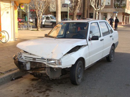 A las 17:30 horas se produjo el segundo choque en nuestra ciudad, en el mismo se encontraron una motocicleta con un automóvil. En las calles de Salta y Eva Duarte de Perón (Ex Alvear), Mario Daniel Flores de 21 años, soldado voluntario conducía un Fiat 1600 dominio M 078143, mientras que Ricardo Giménez de 18 años y un acompañante circulaban en una motocicleta Mondial 110 C.C, esta en sentido de este a oeste por calle Eva Duarte, mientras que el Fiat iba por calle Salta de Norte a Sur. Los daños materiales que se registraron por el lado del automóvil: Punta de guardabarros doblado (derecho), patente delantera y capot desalineado, por otro lado la moto: los dos espejos retrovisores ...