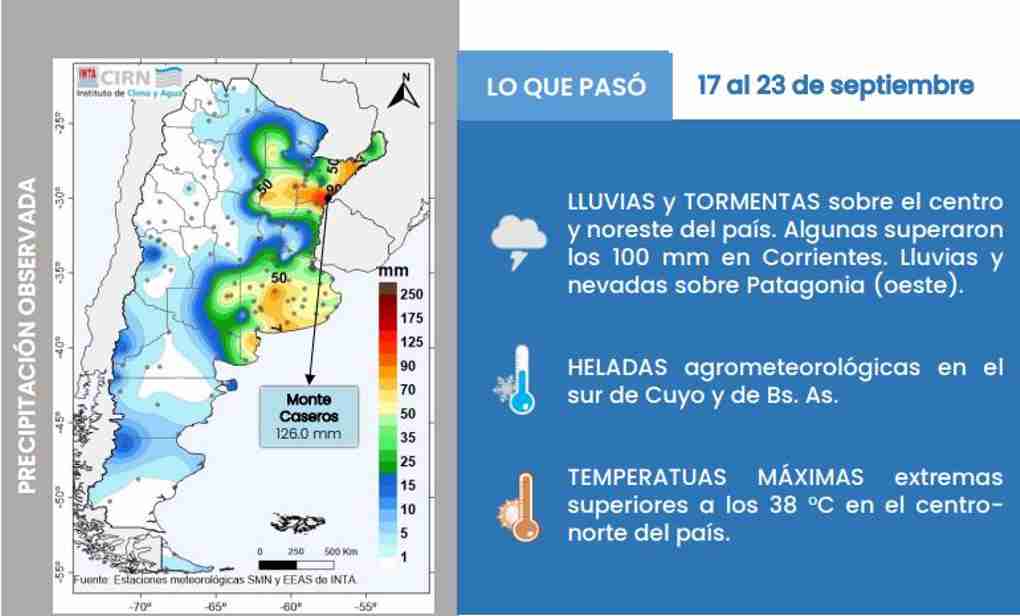 Con la llegada de la primavera, las lluvias se hicieron sentir con intensidad en Corrientes, y en especial en la ciudad de Monte Caseros, que se llevó el récord nacional de precipitaciones entre el 17 y el 23 de septiembre. Según el Informe Agrometeorológico Semanal del Instituto Nacional de Tecnología Agropecuaria (INTA), nuestra localidad registró 126 milímetros de agua caída, el valor más alto en todo el país durante ese período.