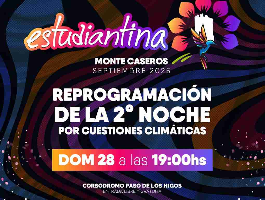 La Municipalidad de Monte Caseros informó que, debido a las condiciones climáticas, la segunda noche de la Estudiantina 2025 debió ser reprogramada para este domingo 28 de septiembre a las 19:00 horas, en el Corsódromo Paso de los Higos, con entrada libre y gratuita.