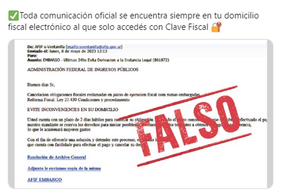 Ante esta situación, el organismo recaudador informó a través de su cuenta oficial de Twitter, que no solicita pagos ni datos personales vía mail, así como tampoco informa sobre embargos o situaciones fiscales. La AFIP recomendó chequear el nombre y la dirección del remitente....