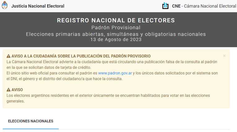 A través de la página oficial de la Cámara Nacional Electoral del Poder Judicial de la Nación y de sus redes sociales informaron que existe una web falsa que solicita datos de tarjeta de crédito, por lo que recomiendan precaución.