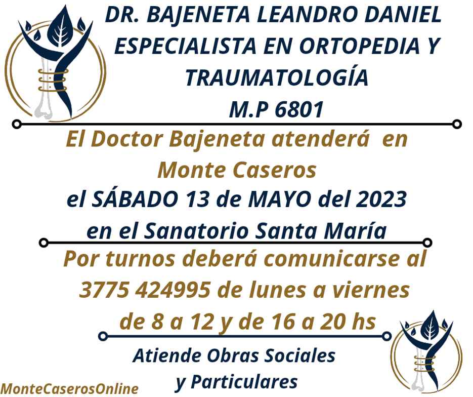 El Doctor Bajeneta Leandro Daniel, especialista en Ortopedia y Traumatología M.P 6801 estará en Monte Caseros el sábado 13 de mayo. El Profesional de la salud atenderá de manera particular y con Obras Sociales. Deberá solicitar turnos para su atención.