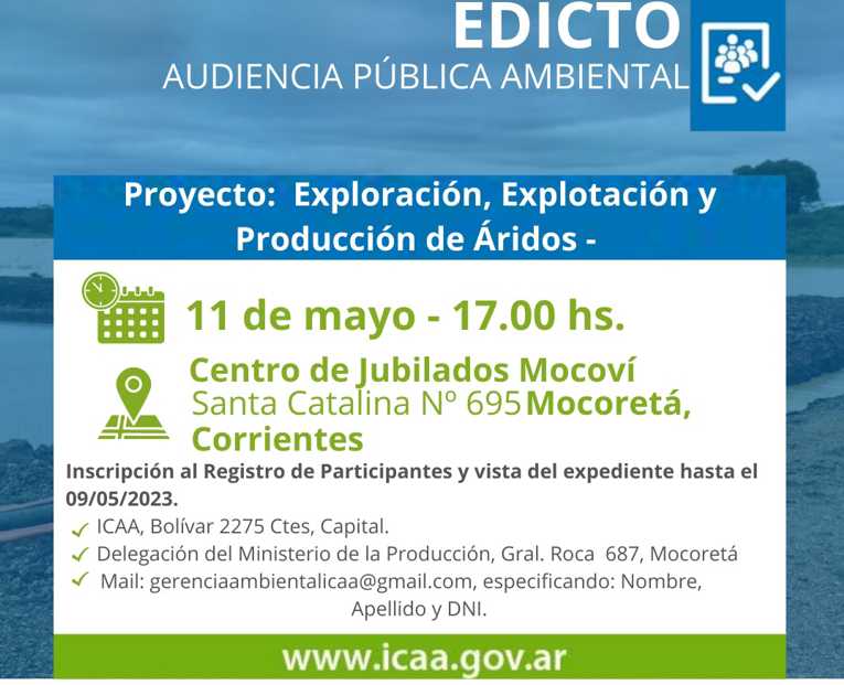 El Instituto Correntino del Agua y del Ambiente (ICAA) convocó a Audiencia Pública Ambiental para el proyecto de exploración, explotación y producción de áridos, en Colonia San Gregorio, Cuarta Sección Rural de la ciudad de Mocoretá, Departamento Monte Caseros....