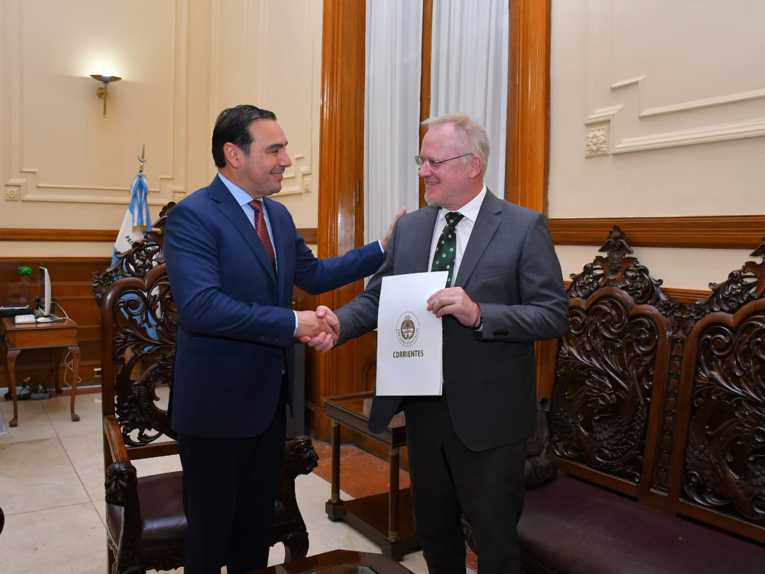 El gobernador Gustavo Valdés recibió este viernes en su Despacho de Casa de Gobierno, al embajador de Austria en Argentina, Andreas Melán, con el objetivo de profundizar el vínculo bilateral con eje en la producción forestal. Cabe recordar que fondos austríacos invierten en la construcción del aserradero que será el más grande del país, situado en Virasoro, y que generará hasta mil puestos de trabajos de manera directa y 600 indirectos.