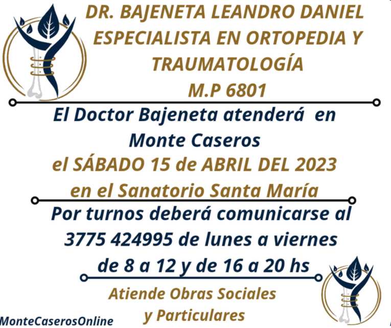 El Doctor Bajeneta Leandro Daniel, especialista en Ortopedia y Traumatología M.P 6801 estará en Monte Caseros el sábado 15 de abril. El Profesional de la salud atenderá de manera particular y con Obras Sociales. Deberá solicitar turnos para su atención.