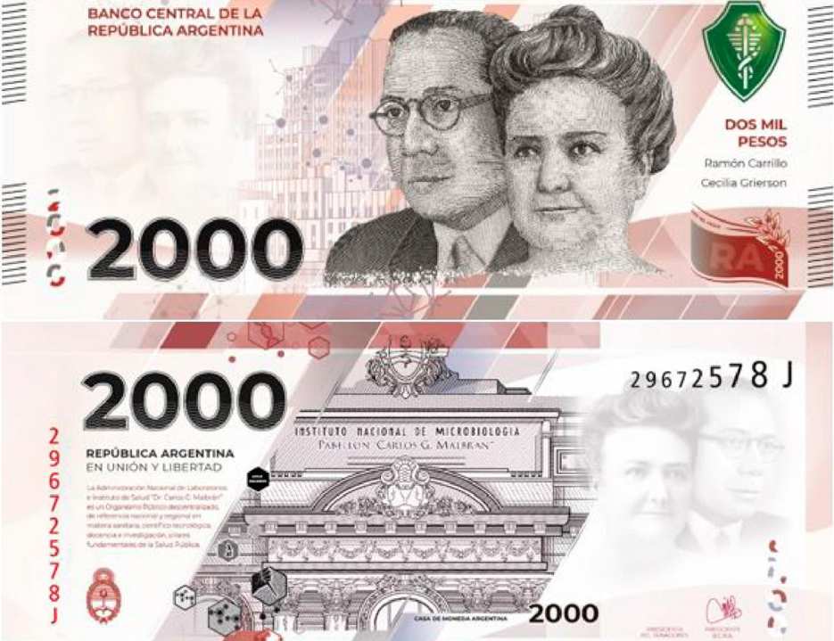 El nuevo billete de 2.000 pesos, aprobado por el directorio del Banco Central, tendrá como imágenes centrales “al Instituto Malbrán, y a la Dra. Cecilia Grierson y al Dr. Ramón Carrillo, precursores en el desarrollo de la medicina en nuestro país”, según explicó la entidad en un comunicado.