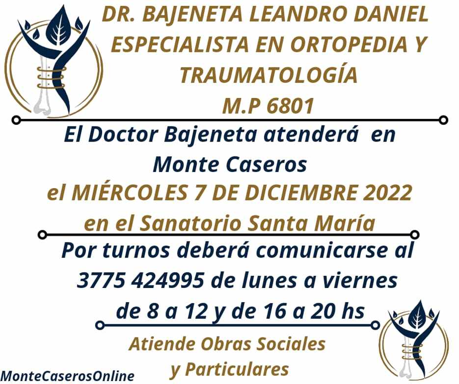 El Doctor Bajeneta Leandro Daniel, especialista en Ortopedia y Traumatología M.P 6801 estará en Monte Caseros el miércoles7 de diciembre. El Profesional de la salud atenderá de manera particular y con Obras Sociales.