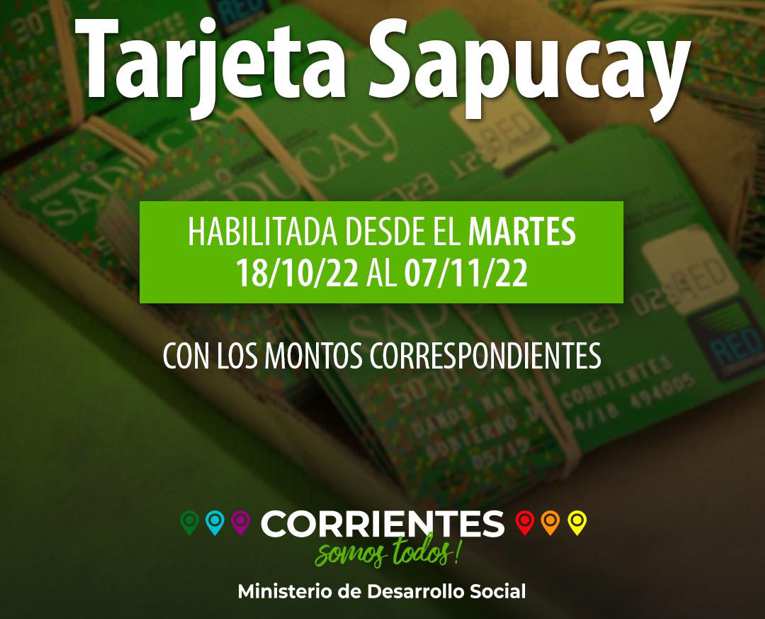 El Ministerio de Desarrollo Social del Gobierno de Corrientes informa a los beneficiarios del Programa que las Tarjetas Sapucay desde este martes 18 estarán habilitadas hasta el 7 de noviembre.