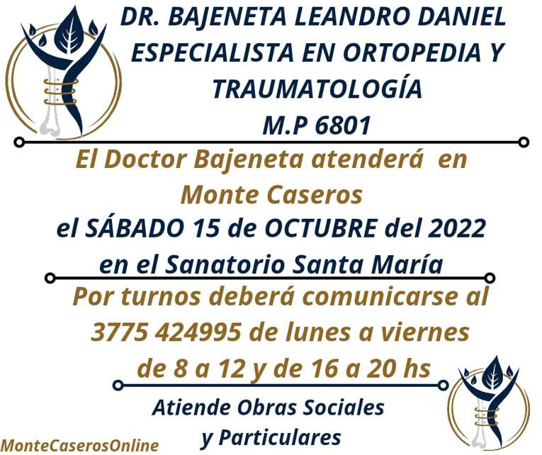 El Doctor Bajeneta Leandro Daniel, especialista en Ortopedia y Traumatología M.P 6801 estará en Monte Caseros el sábado 15 de octubre. El Profesional de la salud atenderá de manera particular y con Obras Sociales.