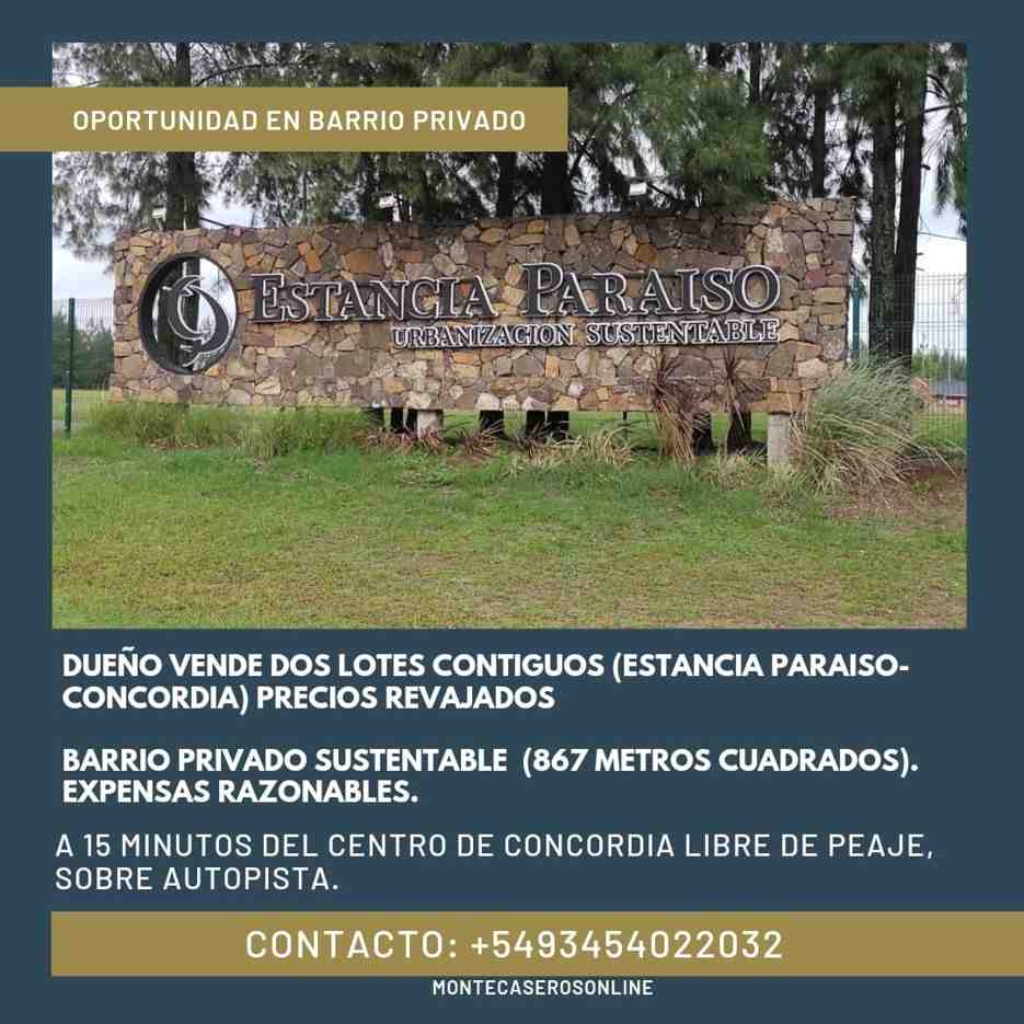 Dueño vende dos lotes contiguos (Estancia Paraíso-Concordia-Barrio Privado Sustentable) 867 metros cuadrados. Expensas razonables. A 15 minutos del centro de la ciudad, libre de peaje sobre autopista.-