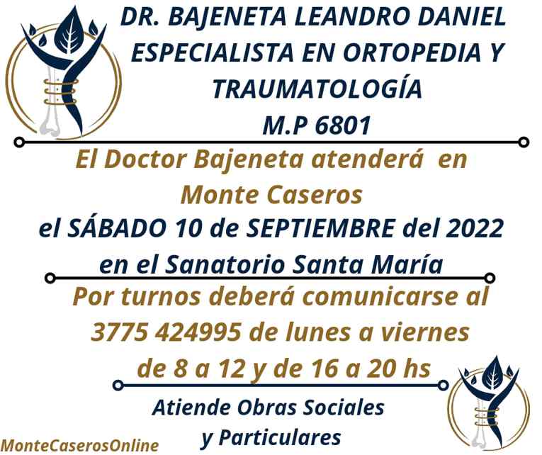 El Doctor Bajeneta Leandro Daniel, especialista en Ortopedia y Traumatología M.P 6801 estará en Monte Caseros el sábado 10 de septiembre. El Profesional de la salud atenderá de manera particular y con Obras Sociales.