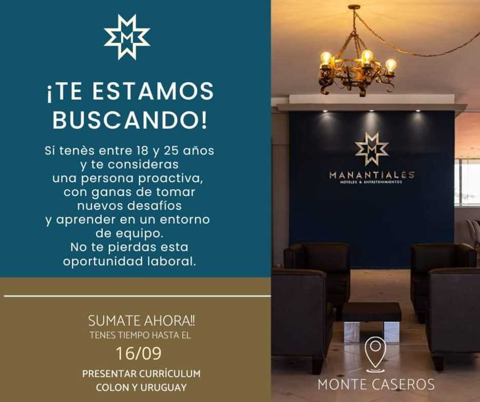 Manantiales Hoteles & Entretenimientos te está buscando, no dejes pasar esta gran oportunidad laboral acerca tu curriculum en las instalaciones del Hotel ubicado en Colon y Uruguay, recordá que tenes tiempo hasta el próximo viernes 16....