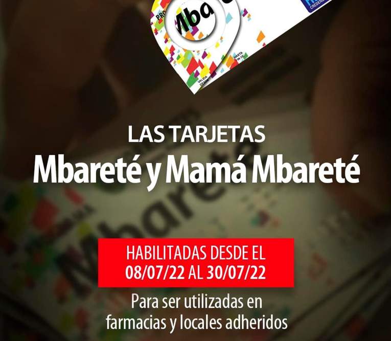 El Gobierno provincial, a través del Ministerio de Salud Pública, a cargo de Ricardo Cardozo, comunica que las tarjetas Mbareté y Mamá Mbareté se encuentran habilitadas desde hoy, 8 de julio, hasta el 30 de julio del 2022 inclusive, para ser utilizadas por los beneficiarios de las mismas.