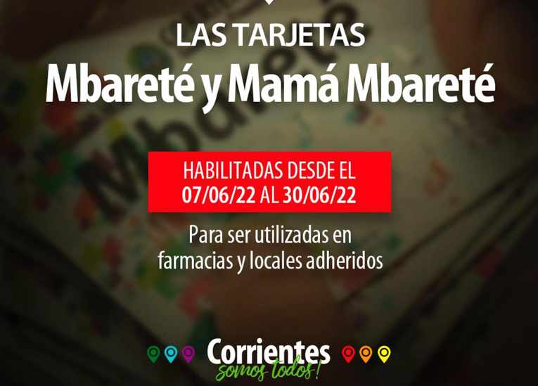 El Gobierno provincial, a través del Ministerio de Salud Pública comunica que las tarjetas Mbareté y Mamá Mbareté se encuentran habilitadas desde el día de la fecha 07 de junio hasta el 30 de junio del 2022 inclusive, para ser utilizadas por los beneficiarios de las mismas.