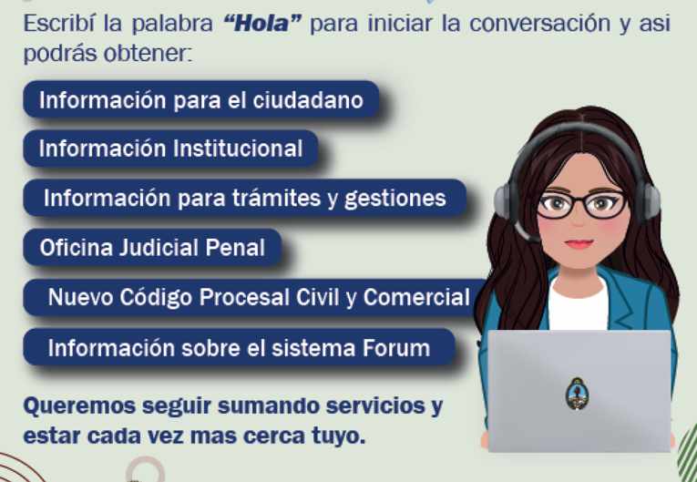 Con el objetivo de acercar la Justicia a la sociedad, desde este lunes el Ministerio Público y el Poder Judicial ofrecen un chatboot, un asistente virtual que se comunica con los usuarios mediante mensajes, con total disponibilidad horaria, durante todo el año. Ofrece opciones de consulta y devuelve respuestas de manera automática.