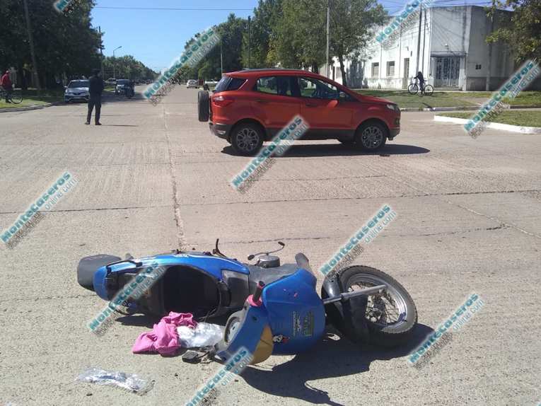 Un automóvil Ford Escort dominio MNC 216 guiado por Silvia Yudiche y una motocicleta Guerrero Trip 110cc en la que se trasladaba una femenina protagonizaron un choque en la esquina de Juan Pujol y Entre Ríos. Producto del impacto, la conductora del rodado de menor porte debió ser derivada al hospital para ser asistida.