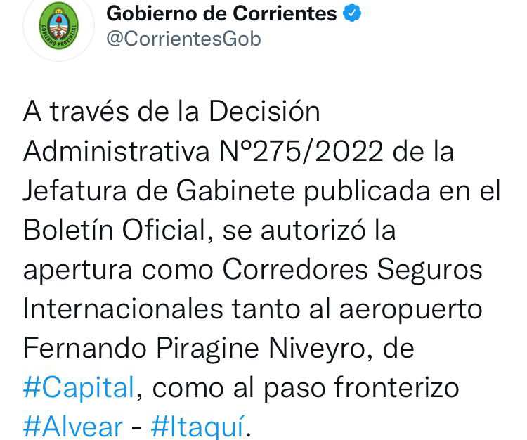 El Gobierno nacional autorizó la apertura como Corredores Seguros Internacionales al aeropuerto Piragine Niveyro de Capital y al paso fronterizo entre los puertos de Alvear y la localidad brasileña de Itaquí. La medida, publicada en el Boletín Oficial este lunes, suma a Corrientes dos nuevos puntos de ingreso al país con medidas sanitarias aprobadas, además de los cruces Paso de los Libres-Uruguayana y Santo Tomé-Sao Borja.