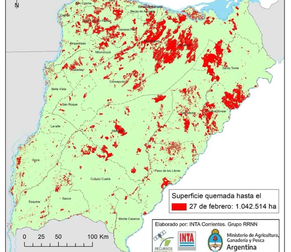 La superficie afectada por el fuego en la provincia de Corrientes ya alcanzó las 1.042.514 hectáreas, el equivalente al 12% de su territorio, según un informe del Grupo de Recursos Naturales de la Estación Experimental Agropecuaria de esa provincia difundido hoy, correspondientes al 27 de febrero de 2022.