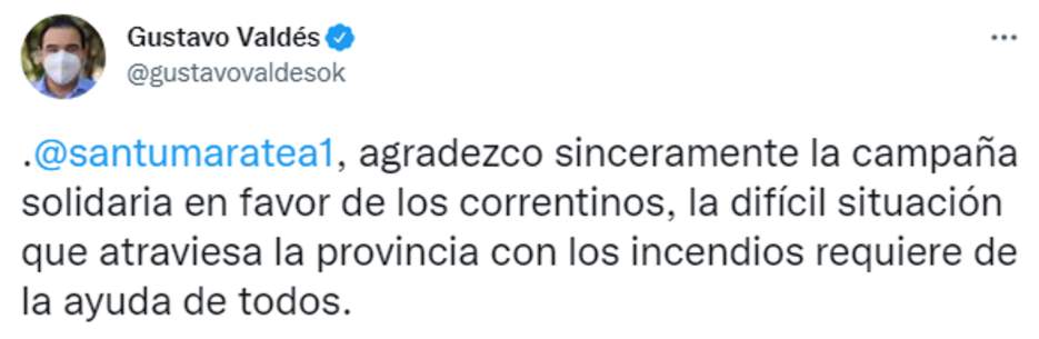 El gobernador Gustavo Valdés, a través de su cuenta de Twitter (gustavovaldesok) agradeció las donaciones realizadas por los argentinos mediante la campaña solidaria llevada a cabo por Santiago Maratea en las redes sociales. “La difícil situación que atraviesa la provincia con los incendios requiere la ayuda de todos”, finalizó.