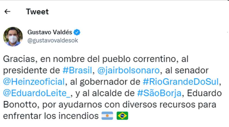 A través de su cuenta oficial de Twitter, el gobernador Gustavo Valdés manifestó su agradecimiento al presidente de Brasil, Jair Bolsonaro, por el envío de recursos a la provincia para hacer frente a los distintos focos ígneos activos. Asimismo, el mandatario extendió su gratitud al senador federal Luis Heinze, a su par del estado de Río Grande Do Sul, Eduardo Leite y al alcalde de la ciudad São Borja, Eduardo Bonotto.