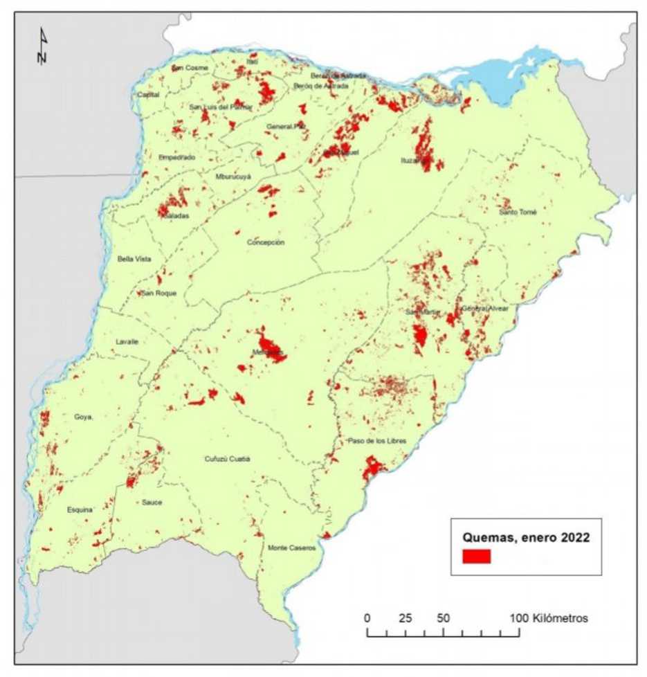 Un informe técnico del Instituto Nacional de Tecnología Agropecuaria (INTA) determinó que la superficie quemada en enero de 2022 en la provincia de Corrientes fue de 335.043 hectáreas. A ello hay que agregarle lo que se afectó en los duros incendios de febrero. Las áreas de humedales fueron las más afectadas.