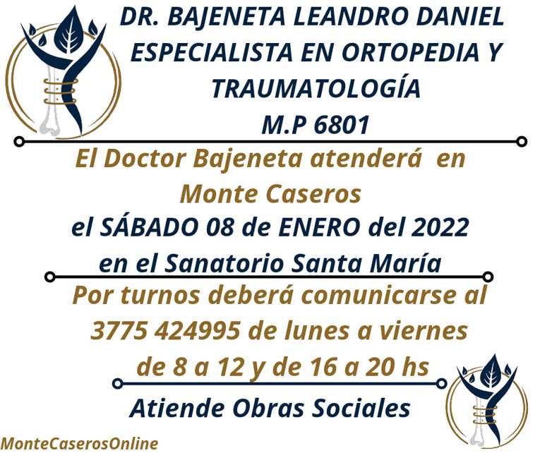 El Doctor Bajeneta Leandro Daniel, especialista en Ortopedia y Traumatología M.P 6801 estará en Monte Caseros el próximo sábado 08 de enero. El Profesional de la salud atenderá de manera particular y con Obras Sociales.