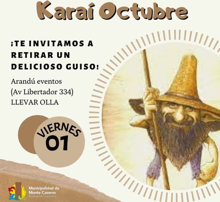 Comenzando con las actividades programas por el mes aniversario de la ciudad. Este viernes 1 de octubre, fecha en que se celebra El KARAÍ OCTUBRE, la Municipalidad de Monte Caseros te invita a pasar con tu olla y retirar un delicioso Guiso de arroz con pollo.
