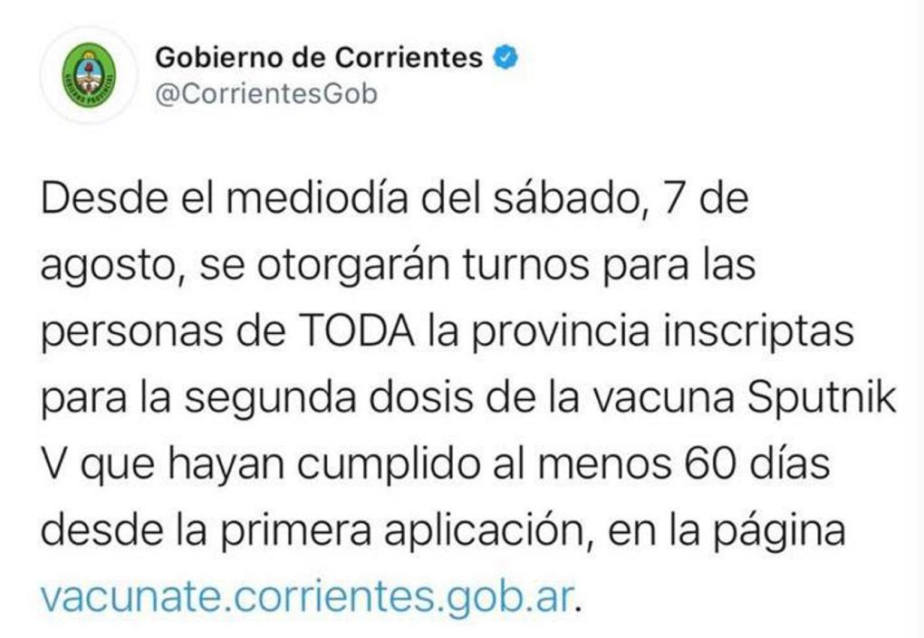 El gobierno de Corrientes informó a través de su cuenta de Twitter que desde el mediodía del sábado 7 de agosto, se otorgarán turnos para las personas de toda la provincia inscriptas para la segunda dosis de la vacuna Sputnik V que hayan cumplido al menos 60 días desde la primera aplicación, en la página www.vacunate.corrientes.gob.ar